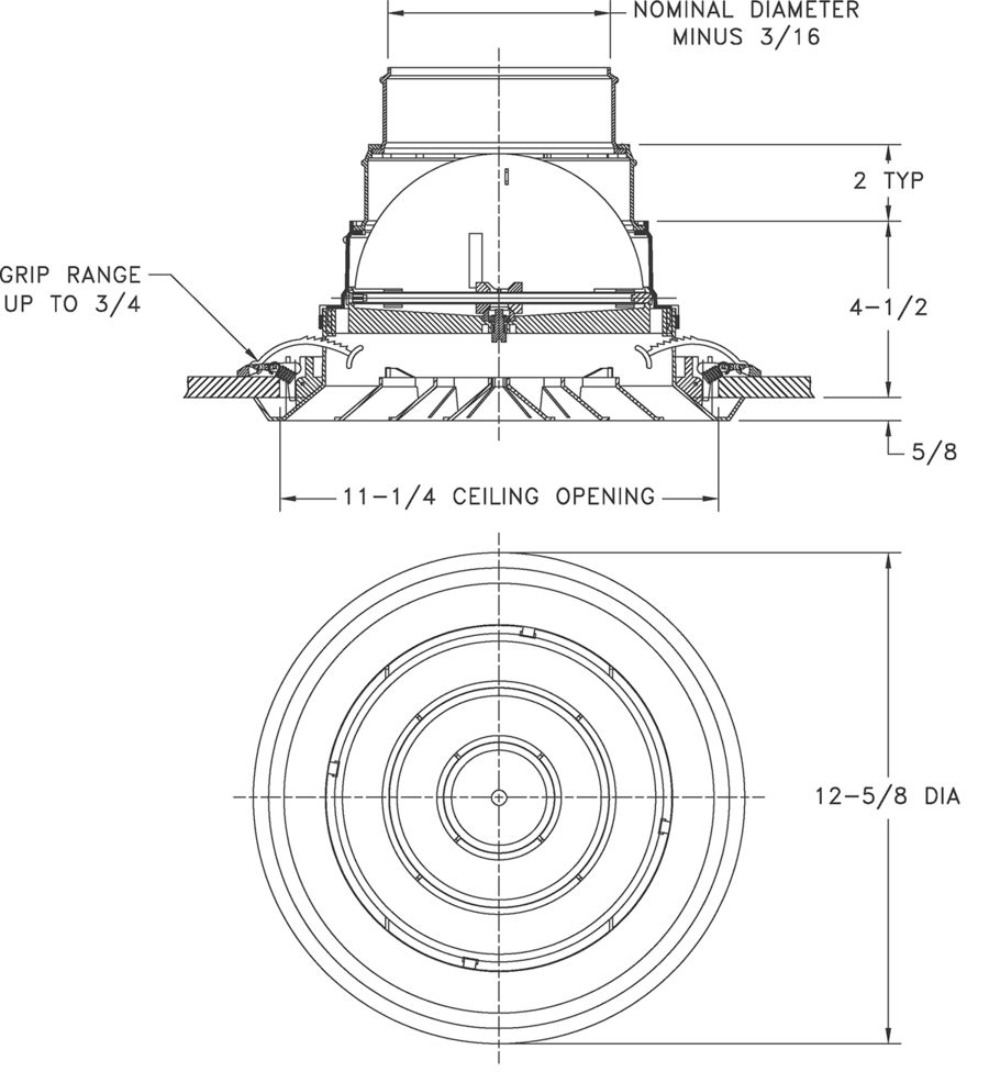- 12" round face. 6", 7" and 8" collars included. Installs without screws using ratcheting cam lock.